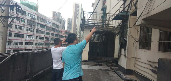 电力部门工作人员查看电线乱接现场,并提出整改方案
