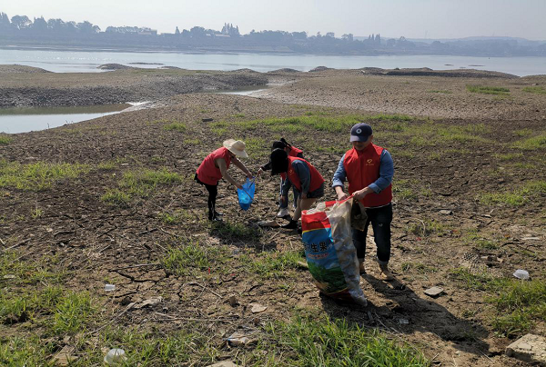 活动现场,志愿者们身穿红马甲,手拿火钳和垃圾袋,分组开展巡河检查、河道清理、分头清理岸边乱扔和乱堆的垃圾。