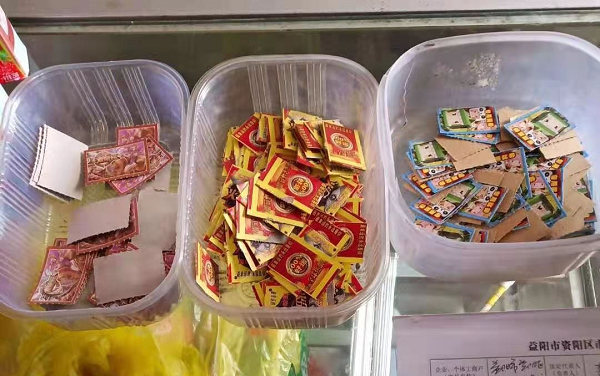 获悉这一情况,资阳区市场监管局立即组织各市场监管所,对辖区中小学校周边文化用品店、小食品店、小超市等可能销售“刮刮卡”的经营门店进行突击检查。该局共检查学校周边127家经营门店,发现6家门店在不起眼的角落内,摆放有专门针对学生儿童的这种“刮刮奖”小彩票。这些彩票的面值金额看起来不是很大,五毛、一元、二元不等,刮开奖券后中奖的概率非常低,就算最幸运,抽中的“奖品”也不过是几毛钱、一张游戏人物卡片或一个廉价的塑料小动物之类小玩意。虽说钱不多,但由于孩子自制力较差、好奇心又强,加上这些“彩票”上印有鲜艳漂亮的卡通图案,吸引不少学生儿童参与,极易让未成年人上瘾或沉迷其中。有的孩子难挡诱惑,甚至偷偷省下自己的早餐费和零花钱来碰碰运气。长期这样下去,难免形成孩子的博彩和投机心理,不利于学生儿童身心健康成长。