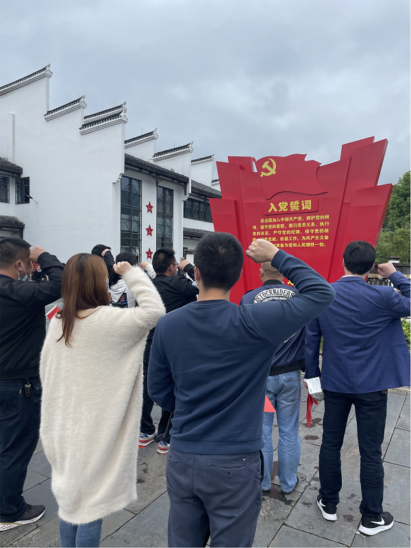 参观完纪念馆后全体党员干部一起佩戴好党徽,面向党旗重温入党誓词。在鲜红的党旗下,党员们举起右拳,神情庄重而严肃,铿锵有力的誓词久久回荡。