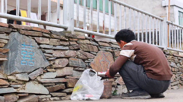 王新民是一名聋哑脱贫户,乐观向上、勤劳和善,他不仅是富民村数一数二地擦菜子制作能手,也是村里人居环境整治工作的志愿者,家中的庭院、草坪、树木都整理得精致别样。一次偶然的机会,他刻了一幅石版画,得到了街坊邻居的夸赞,于是不识字的他常常拿起“画笔”挥锤凿刻,把作品进行有序的插放,让庭院四周的石头都“唱起了歌”。