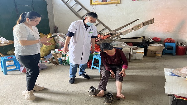 区政务服务中心驻村帮扶工作队在开展防返贫监测工作,走访农户时发现,花门楼组村民戴兰军头部做过开颅手术脑积水严重,长期瘫痪在床,由其母亲孙腊英照顾日常生活起居,其母脚趾严重变形,腰椎间盘突出,导致行走不便。母子俩无生活能力,无就业能力、无残疾人证,只能靠母亲捡废品维持日常生活。