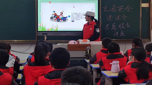 在1702班同学们的课堂上,交警结合事故案例、模拟实验视频、交通安全知识口诀,全方位讲解了“佩戴头盔的重要性”“不佩戴头盔有多危险”“如何正确佩戴头盔”“认识交通标志”等内容。