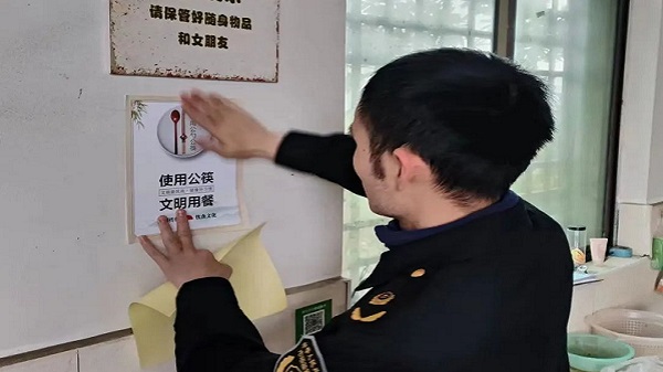监管人员为餐饮单位张(粘)贴“光盘行动”等文明用餐标贴