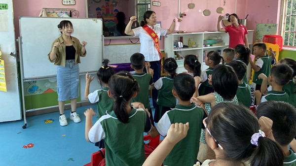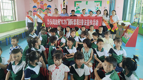 在“6.26国际禁毒日”期间,以“禁毒教育从小抓起”为本次禁毒活动主题,沙头司法所工作人员与禁毒志愿者在幼儿园摆放禁毒宣传画板、教孩子们辨识毒品模型。同时,园方组织孩子们歌唱禁毒版“挖呀挖”,歌曲朗朗上口,生动有趣,在童声中法治口号“出声便入心”。