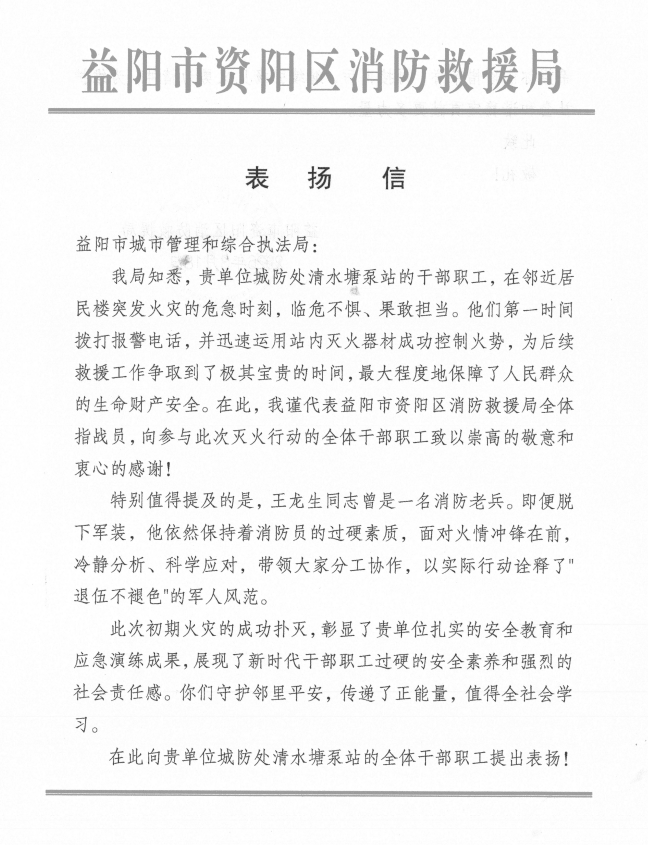 近日,资阳区消防救援局相关负责人专程前往益阳市城管执法局,送上表扬信与消防小熊纪念品,向该局清水塘泵站工作人员致以诚挚谢意,点赞他们在民房火情处置中挺身而出、科学施救的英勇行为。