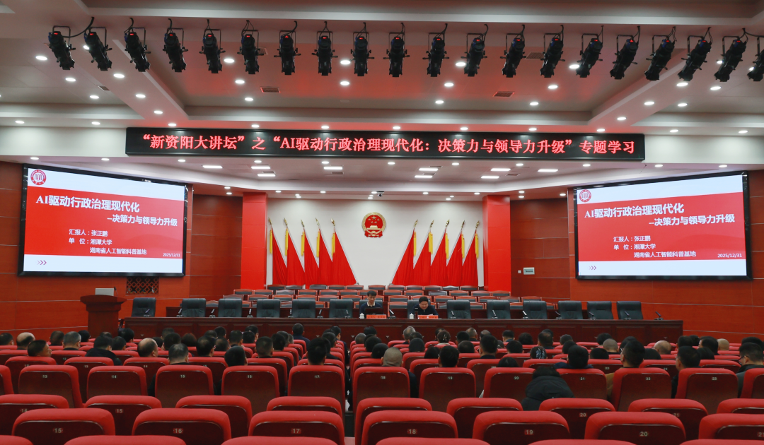 12月31日,“新资阳大讲坛”之“AI驱动行政治理现代化:决策力与领导力升级”专题讲座开讲,湘潭大学教授、博士生导师张正鹏到会作专题辅导,资阳区委书记付振南主持。