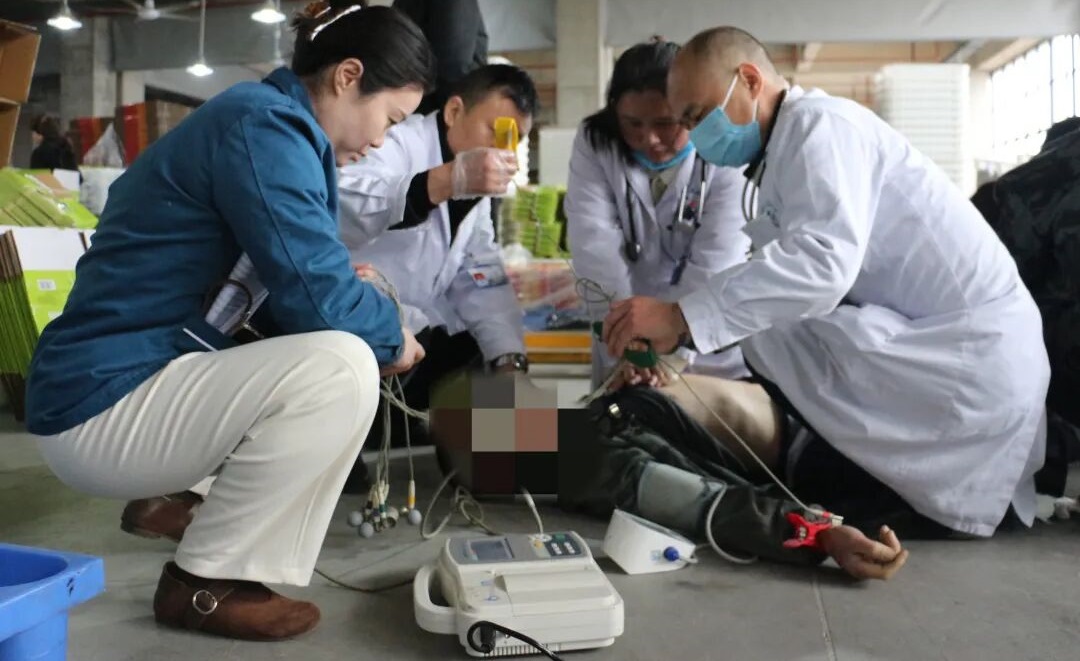 当天,益阳市人民医院多学科专家团队正在新源村开展紧密型医共体“专家下沉送健康”义诊,突然听到厂区传来“有人晕倒了”的呼救。心内科专家徐浩宁、呼吸内科专家陈智敏、普外科专家吉礼辉第一时间赶赴现场,发现一名中年男子已突发晕厥、面色紫青、意识丧失,生命垂危。