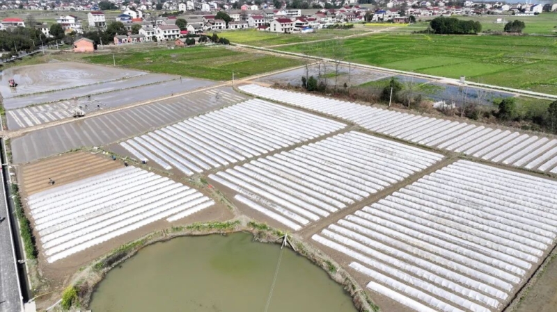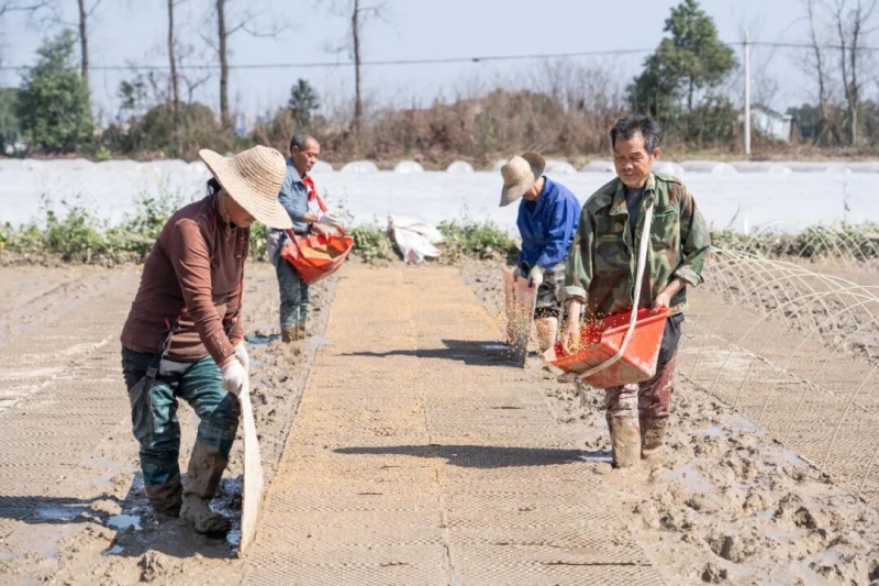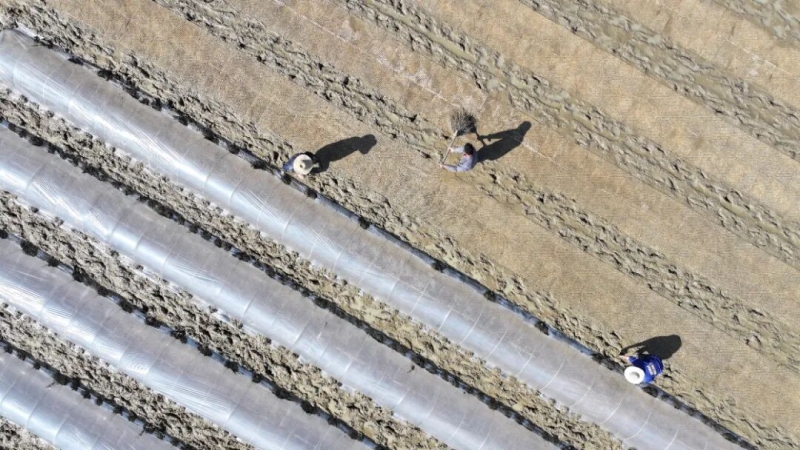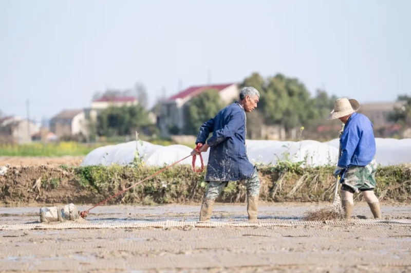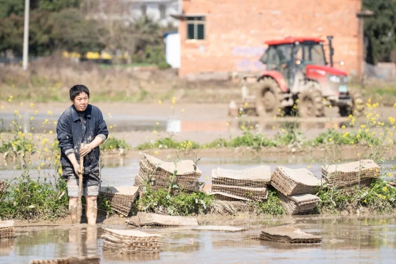 近日,正值早稻育秧关键期,在资阳区新桥河镇廖河村的水稻育秧田里,村民们正抢抓农时,忙着铺秧盘、盖薄膜,农机在田间来回穿梭翻耕整地,田间地头一派繁忙景象。