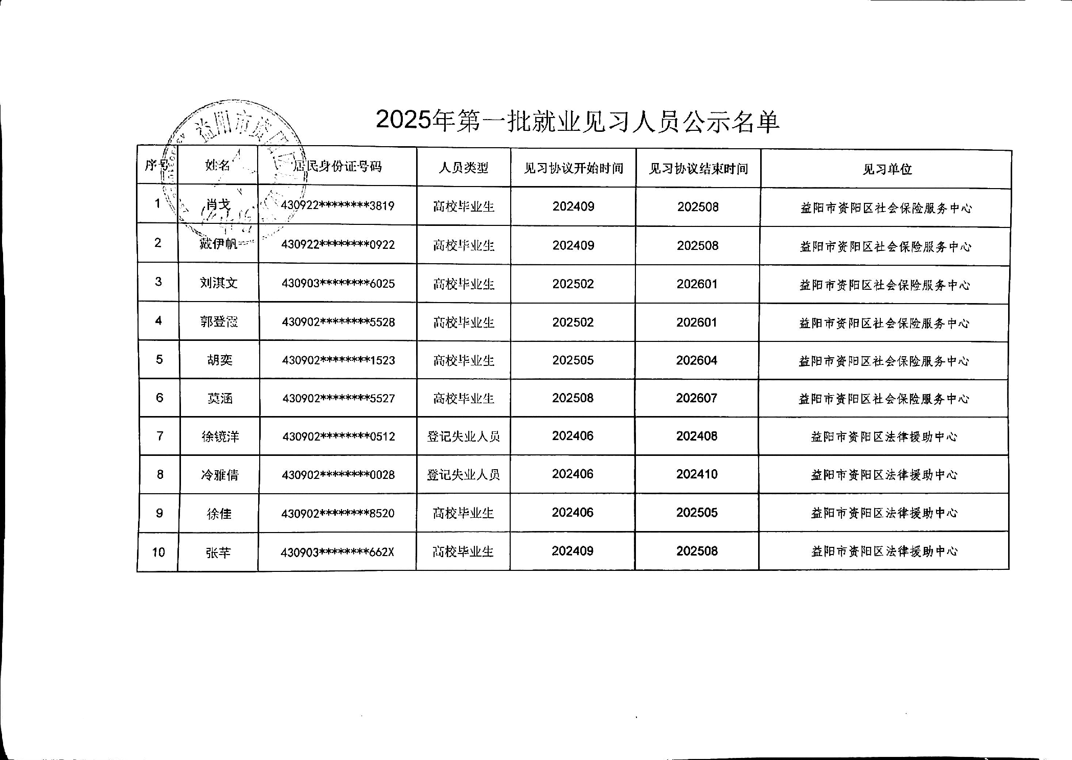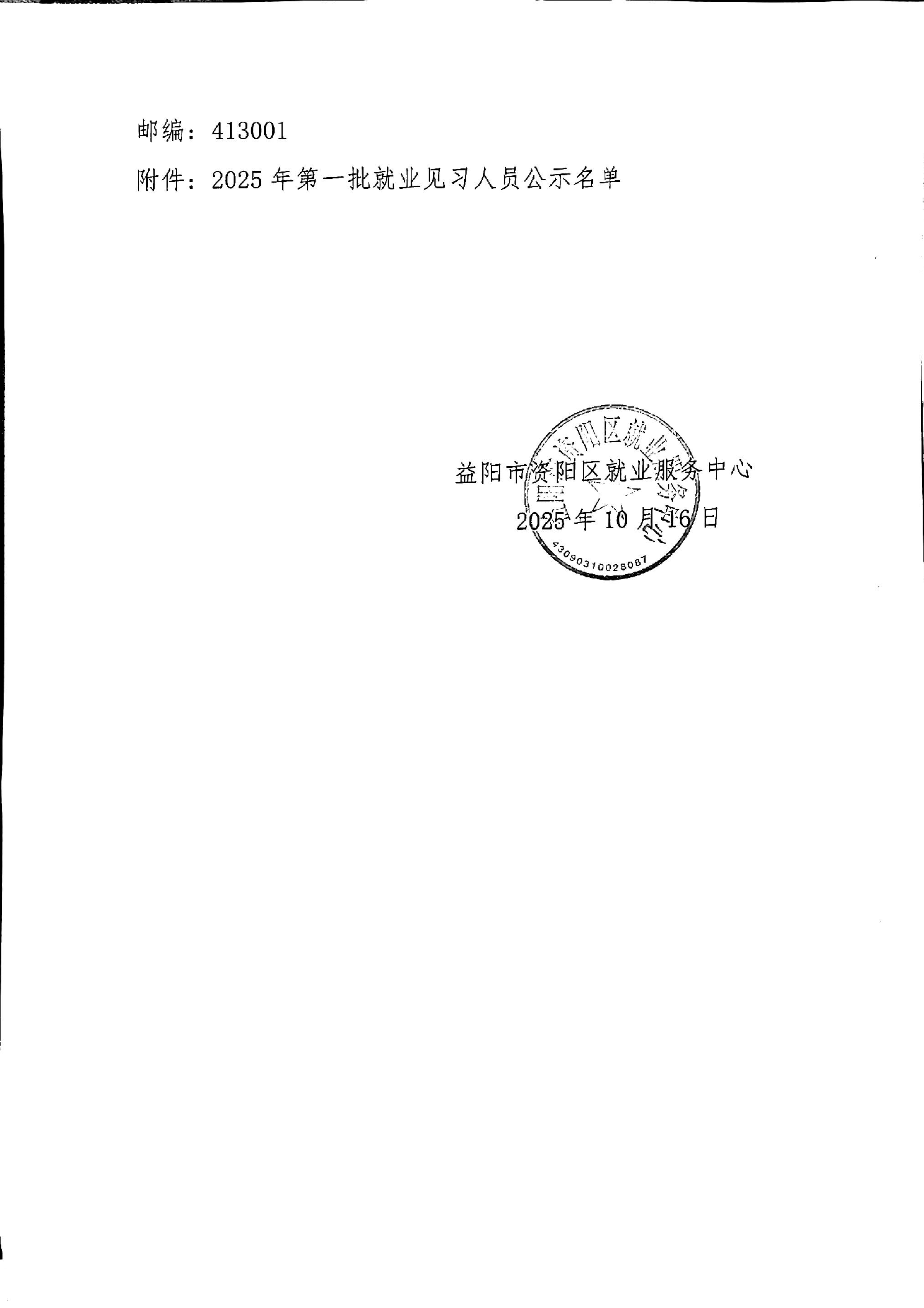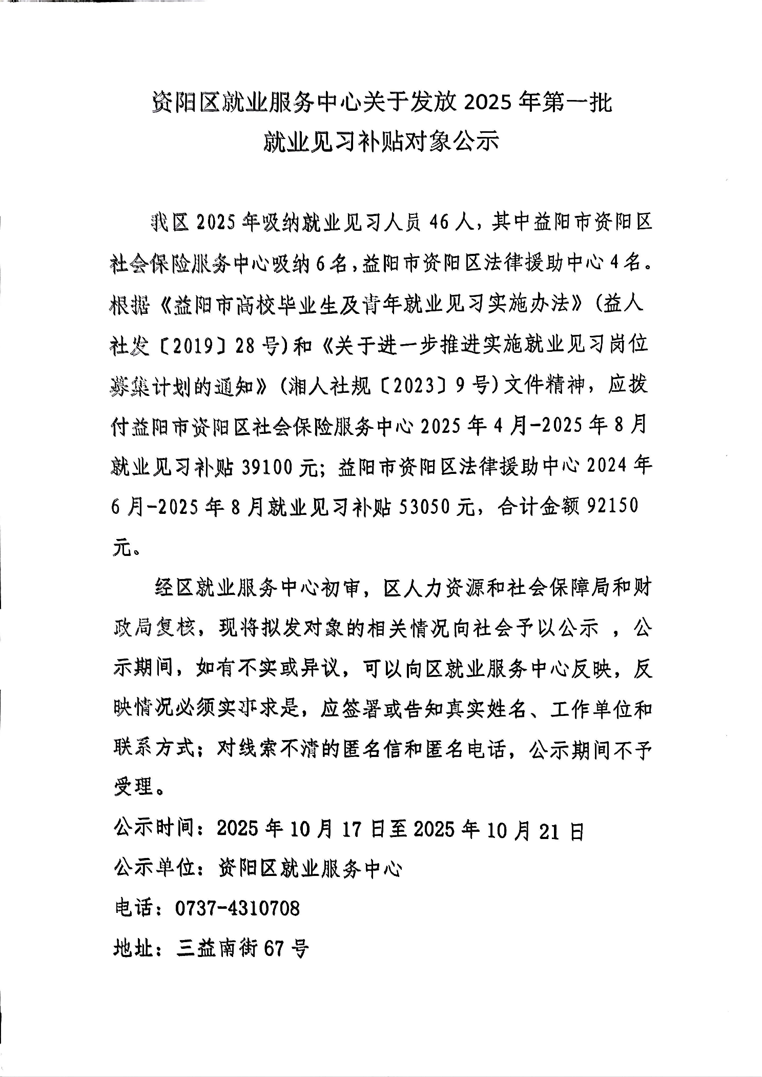 资阳区就业服务中心关于发放2025年第一批就业见习补贴对象公示