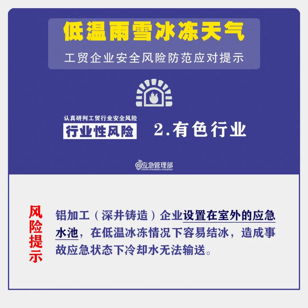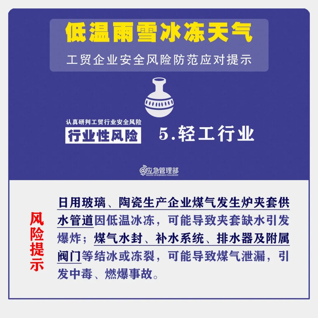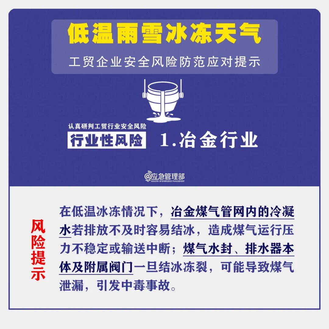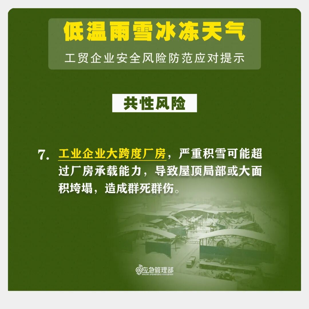 低温雨雪冰冻天气持续时间长、影响范围广,防范不当极易引发事故。为进一步做好工贸企业安全风险防范应对,提示如下: