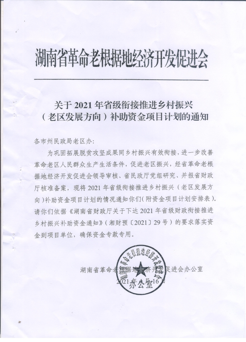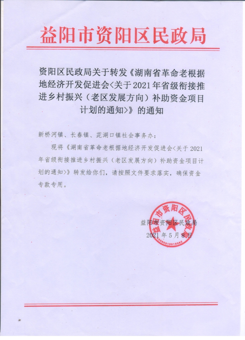 益阳市资阳区民政局关于转发《湖南省革命老根据地经济开发促进会关于2021年省级衔接推进乡村振兴(老区发展方向)补助资金项目计划的通知》的通知