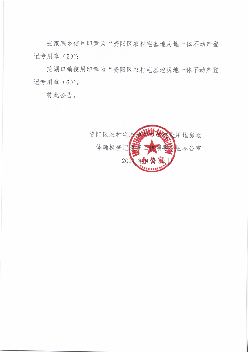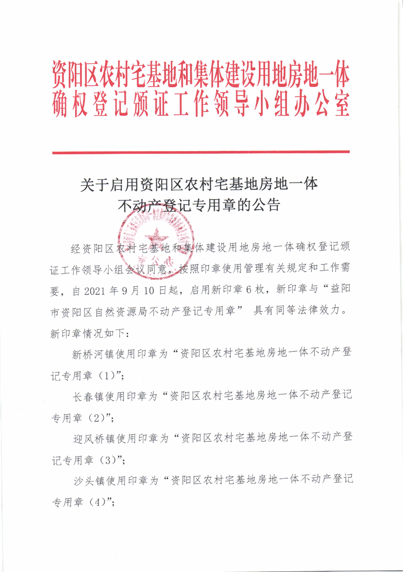 关于启用资阳区农村宅基地房地一体不动产登记专用章的公告