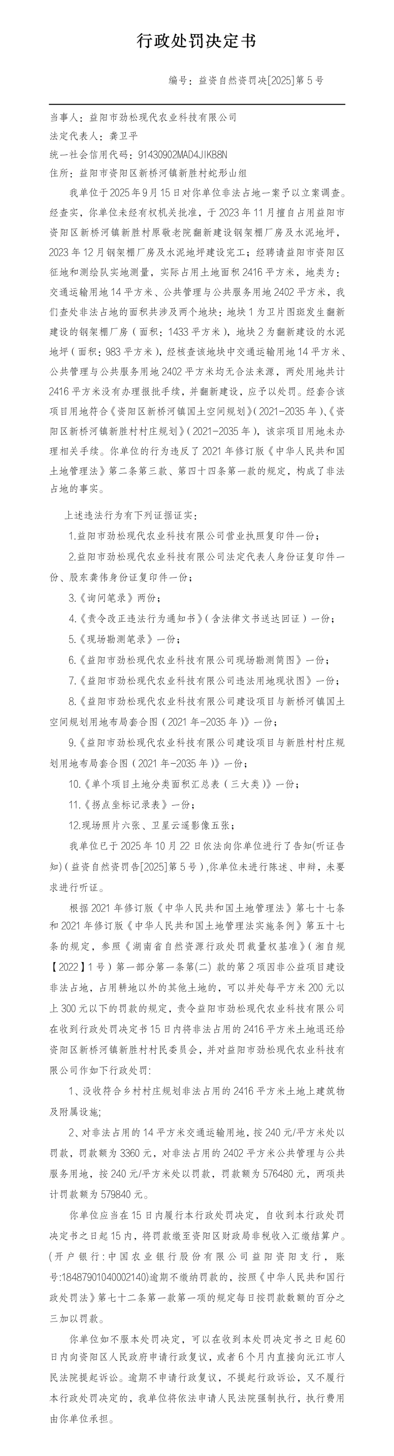 行政处罚决定书 编号:益资自然资罚决[2025]第5号