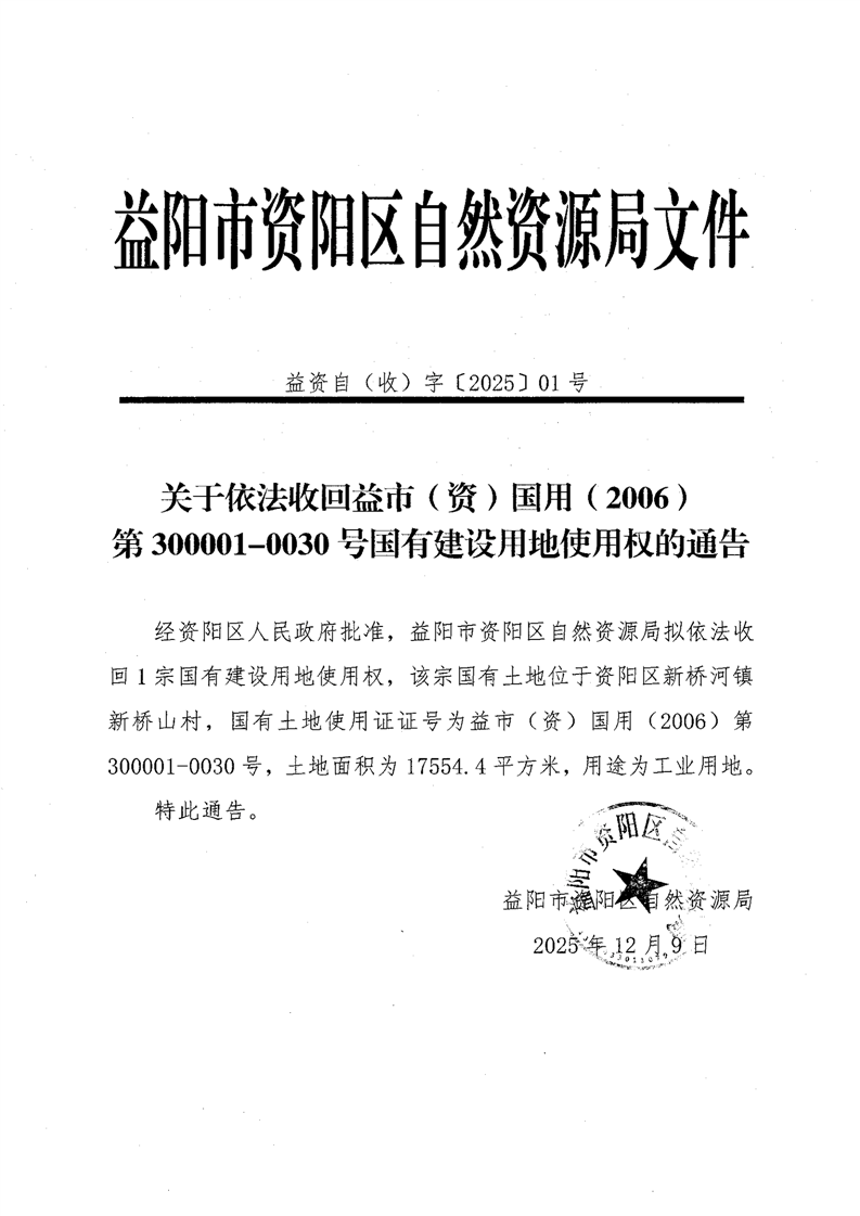 关于依法收回益市(资)国有(2006)第300001-0030号国有建设用地使用权的通告