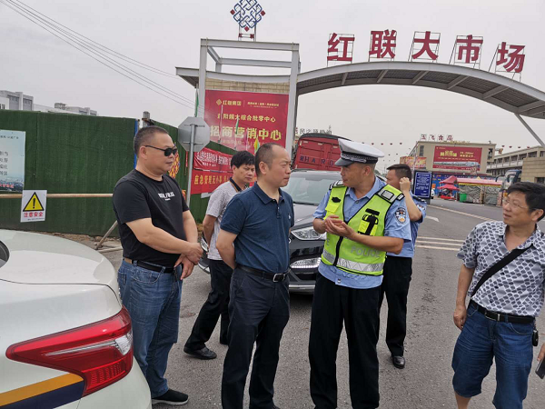邓勇一行在红联市场门口听取该路段整改情况汇报