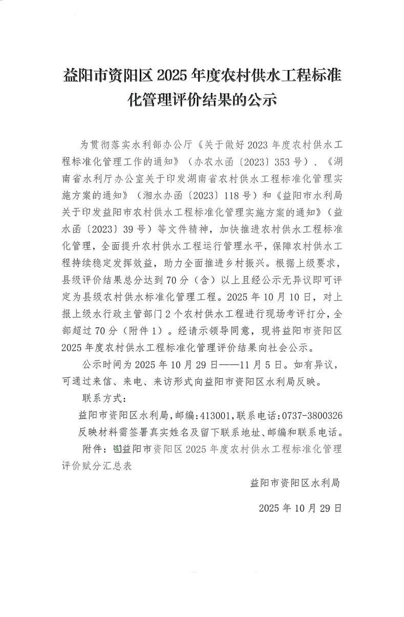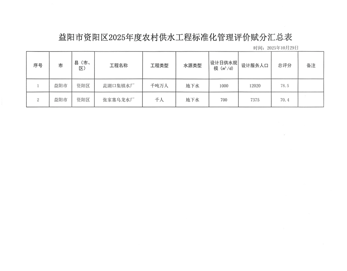 益阳市资阳区2025年度农村供水工程标准化管理评价结果的公示