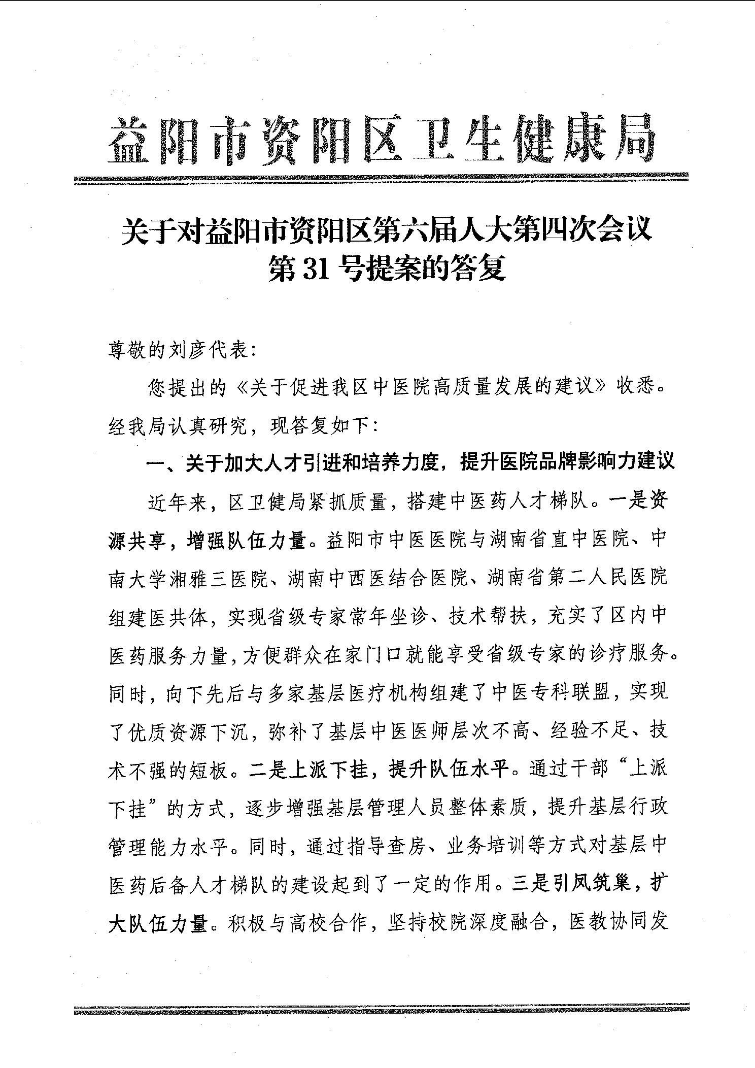 对益阳市资阳区第六届人大第四次会议第31号提案的答复