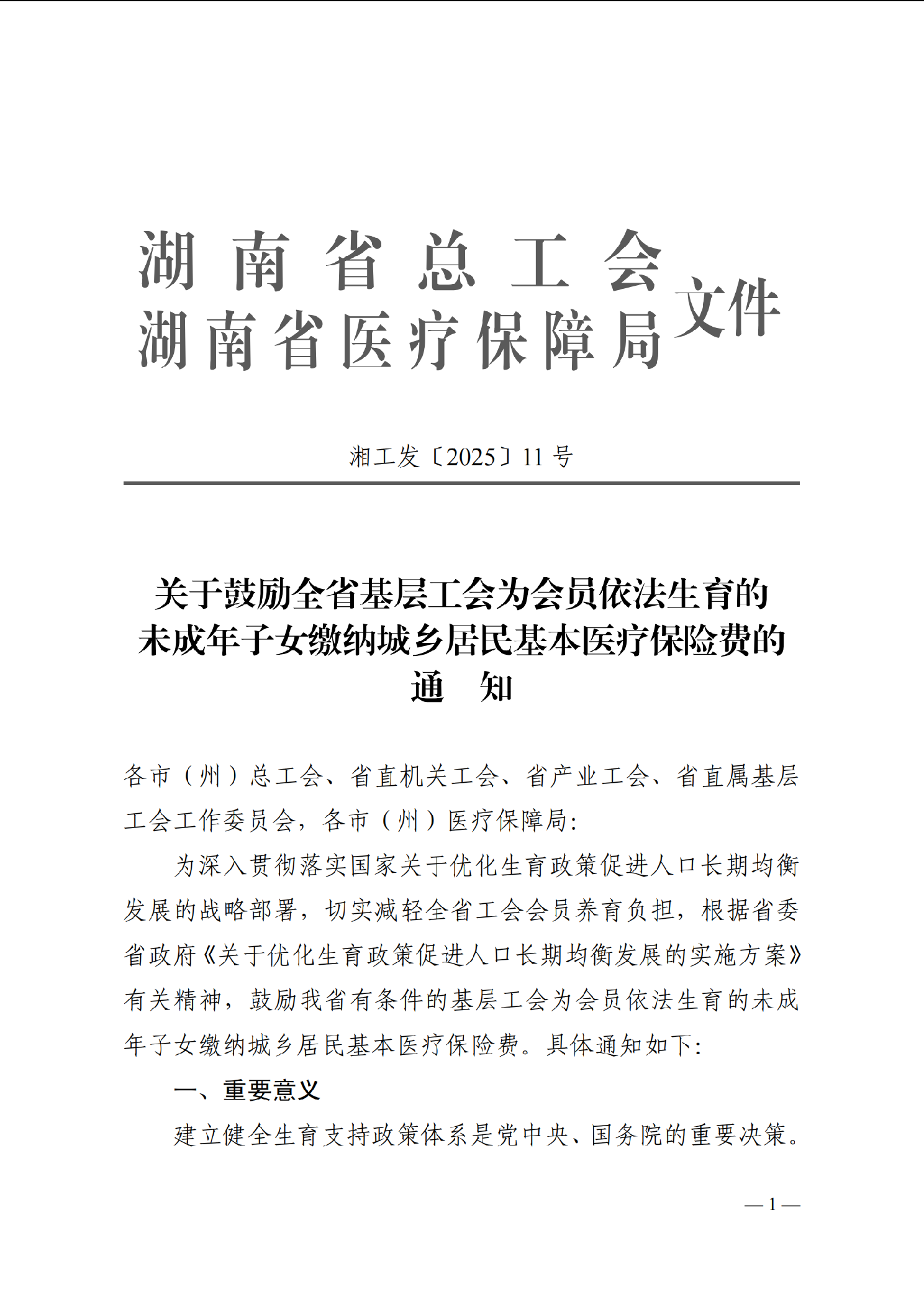 关于鼓励全省基层工会为会员依法生育的未成年子女缴纳城乡居民基本医疗保险费的通知