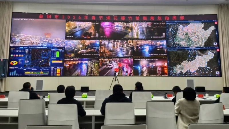 2026年除夕夜,益阳市城市运行指挥中心内灯火通明。为打好春节烟花爆竹禁燃禁放阻击战,市委副书记、市长熊炜,省生态环境厅党组副书记、副厅长黄宇,副市长、市公安局局长史尚篪,副市长罗讯等领导坐镇指挥、实时调度,全体值守人员紧盯一线,依托城市“智慧大脑”,以科技之力守护益阳平安祥和。