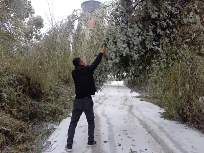 邻长“通联”解民忧。2月4日凌晨,迎风桥镇黄花仑村邻长杨冬林发现村主干道上多棵树木被雪压,导致车辆无法通行,他第一时间告知村干部并与工作人员一起清理树枝,为群众安全出行保驾护航。