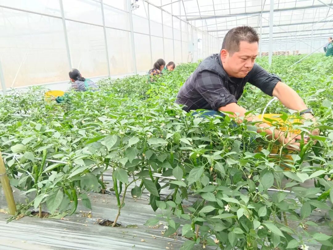 牛角仑联栋大棚内新鲜辣椒采摘现场