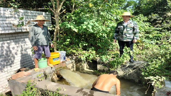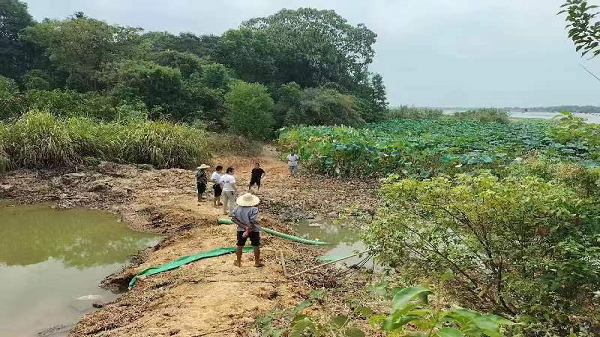 清晨时分,一条长300米的输水管道正在从德兴湖中架设,大潭洲村的抗旱志愿队伍正带着1台大功率抽水设备,天蒙蒙亮就开始了一天的抗旱救灾。