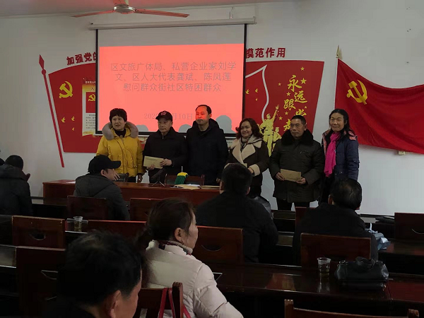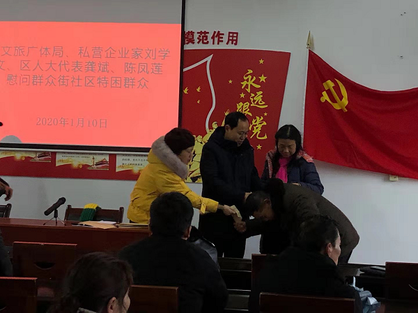 1月10日上午,群众街社区开展了帮困送温暖活动,知名私营企业家、群众街社区二支部优秀党员刘学文为社区的10户困难群众送上祝福和慰问金,鼓励大家树立信心、克服困难。