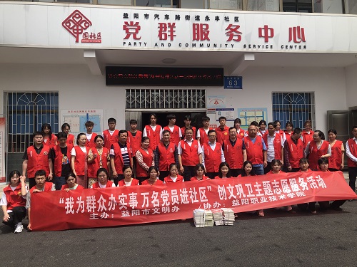 5月27日上午,在益阳市职业技术学院党组书记谢梅成、院长黄维民的带领下,三十余名学生骨干、教职工前来永丰社区助力文明创建,办事处领导宋莎莎陪同。