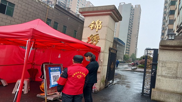 在白马山社区锦绣欣城小区,穿着红色志愿者马甲风雨无阻地在小区门口值守,他们严格落实逢进必登、逢人必测、逢车必查,甄别疫情中、高风险地区返益人员。