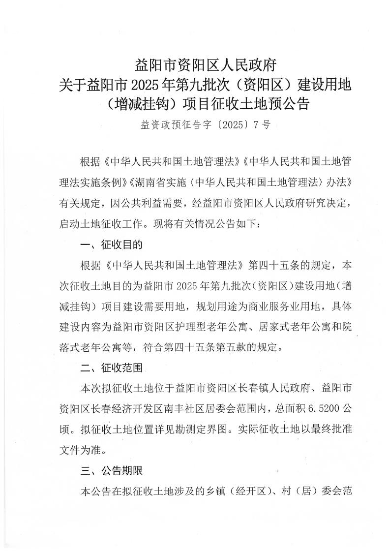 益阳市资阳区人民政府关于益阳市2025年第九批次(资阳区)建设用地(增减挂钩)项目征收土地预公告