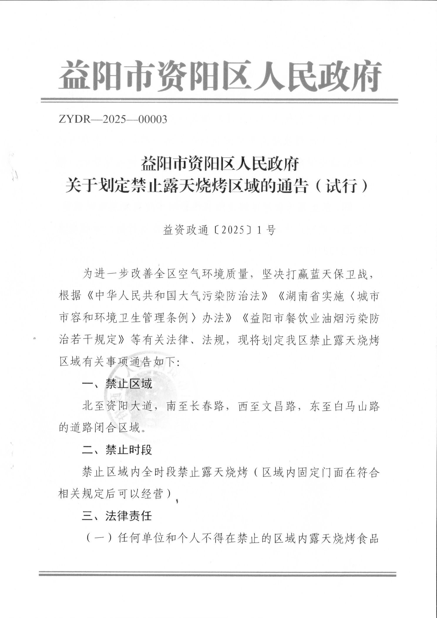 益阳市资阳区人民政府关于划定禁止露天烧烤区域的通告(试行)