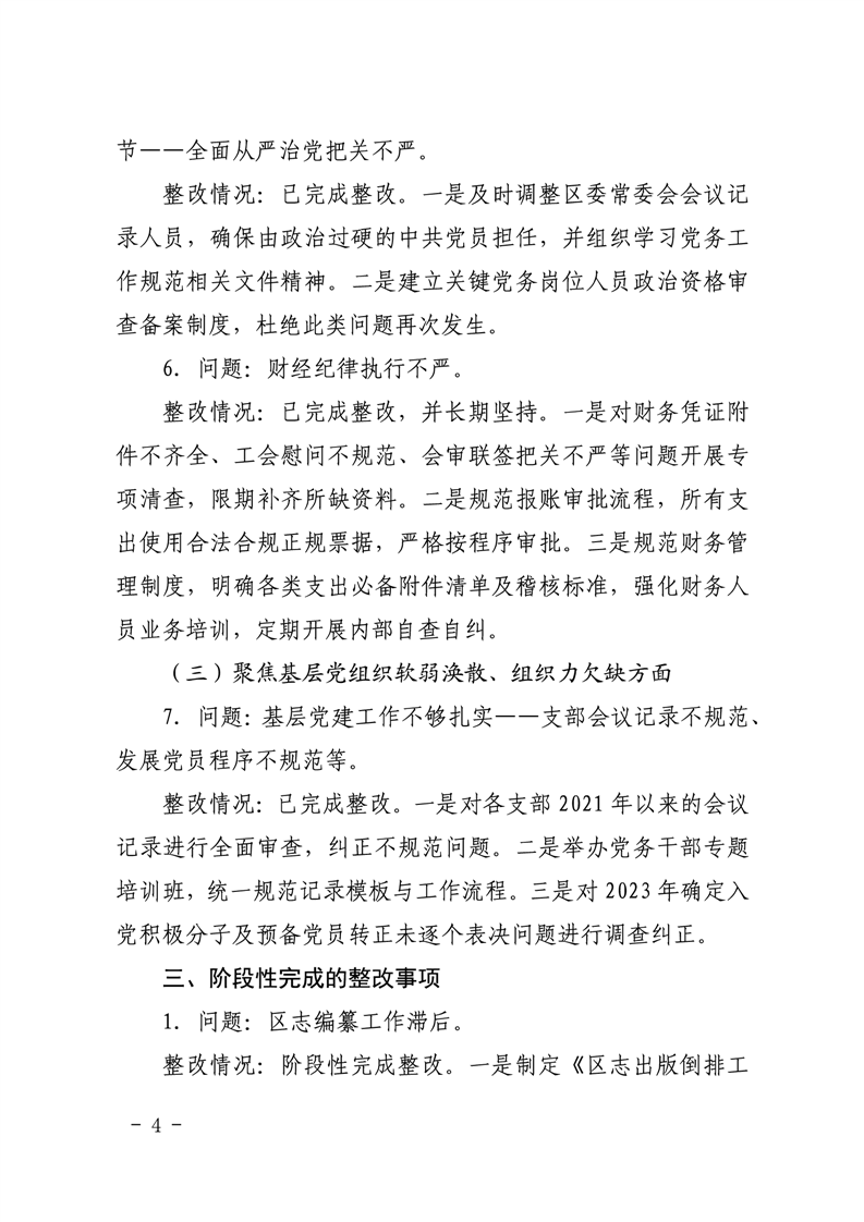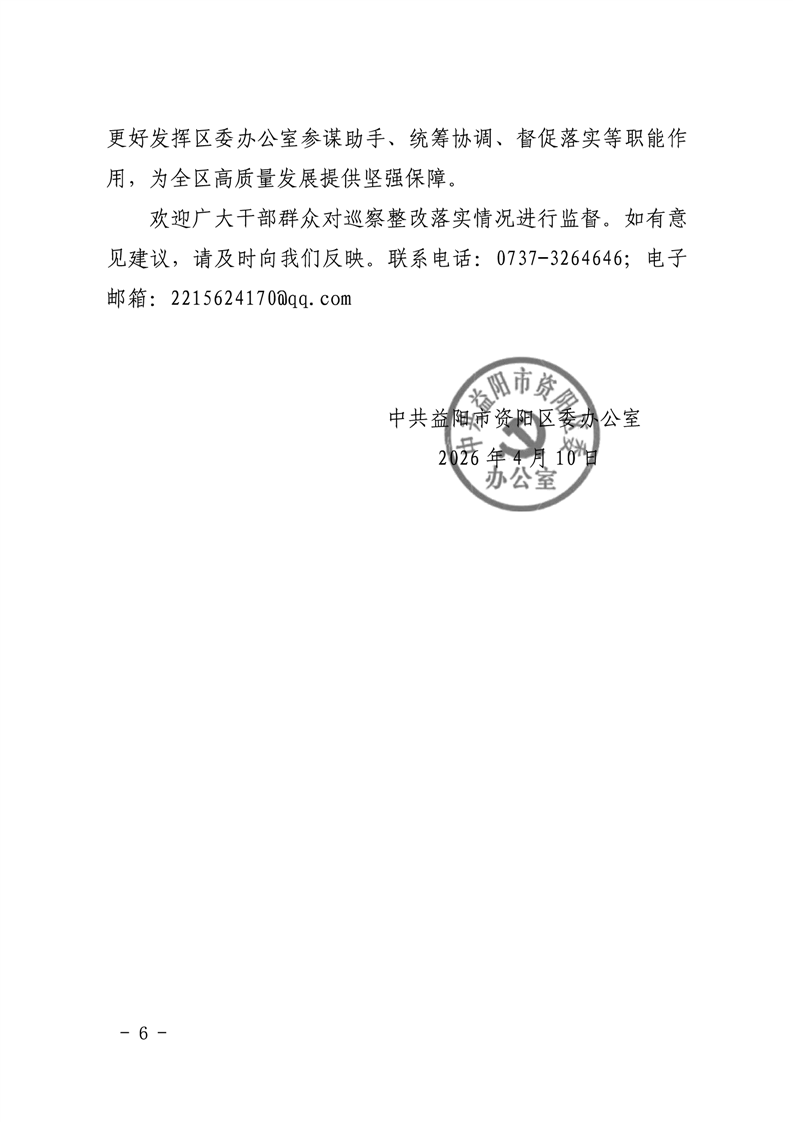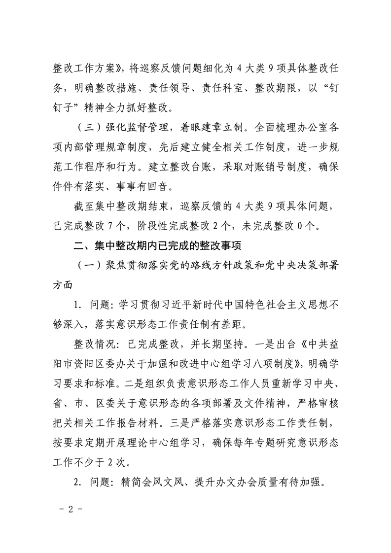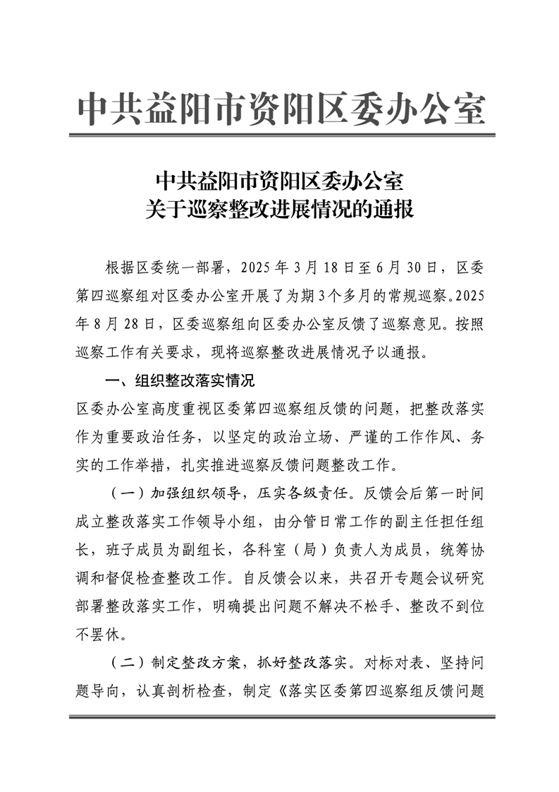 中共益阳市资阳区委办公室关于巡察整改进展情况的通报