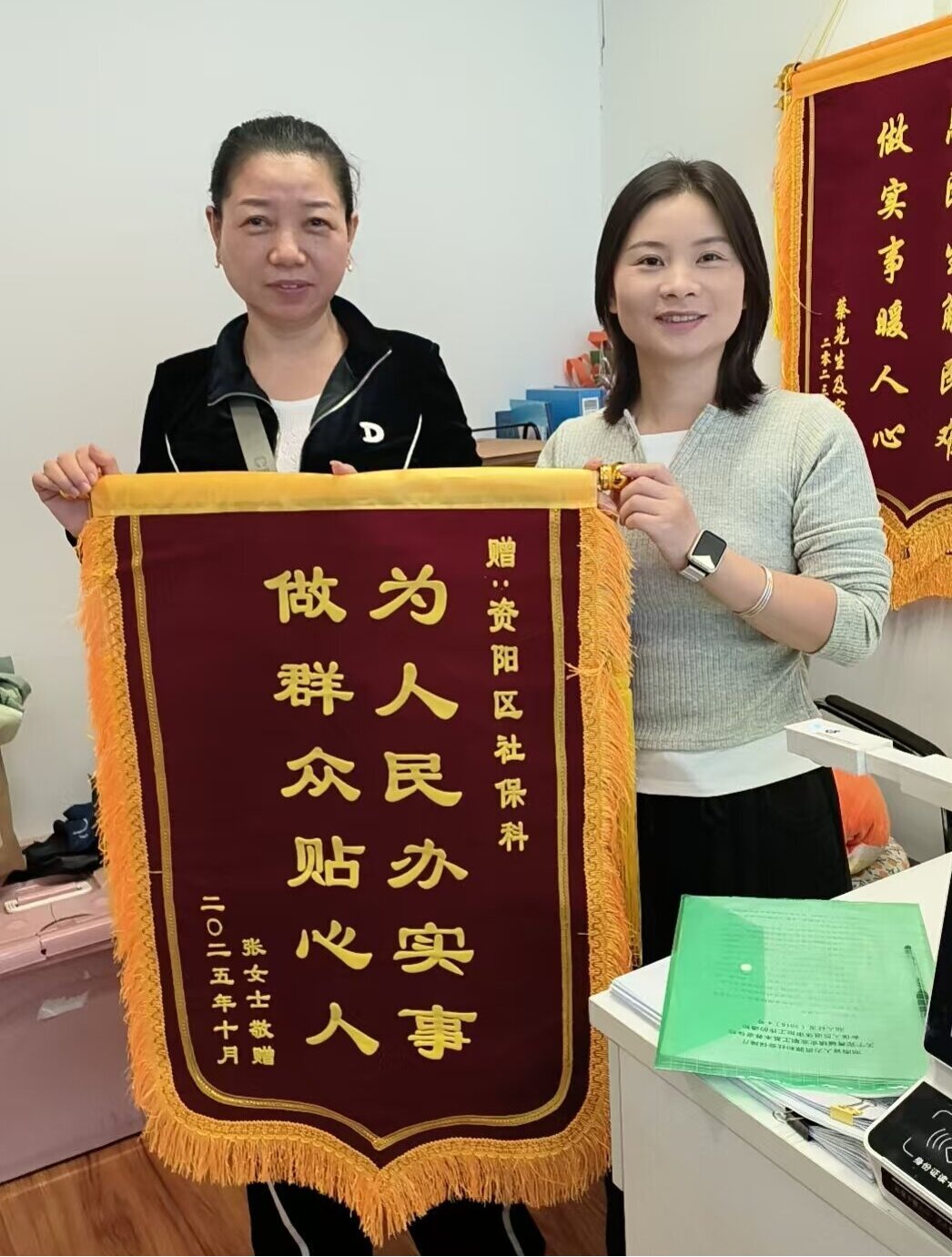 近日,资阳区人社局社会养老保险股办公室内暖意流动,洋溢着喜悦气氛。群众张女士将一面印有“为人民办实事 做群众贴心人”金色大字的锦旗,亲手交到工作人员手中,感谢他们以高度的责任心和专业的协调能力,为她这位原农村合作基金会的下岗职工顺利办理了退休手续。
