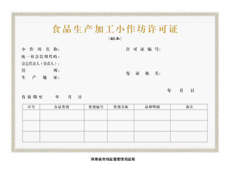 说明:《食品生产加工小作坊许可证》正本为A3纸张规格大小,副本为A4纸张规格大小。各地应按照省局提供的电子模板印制。
