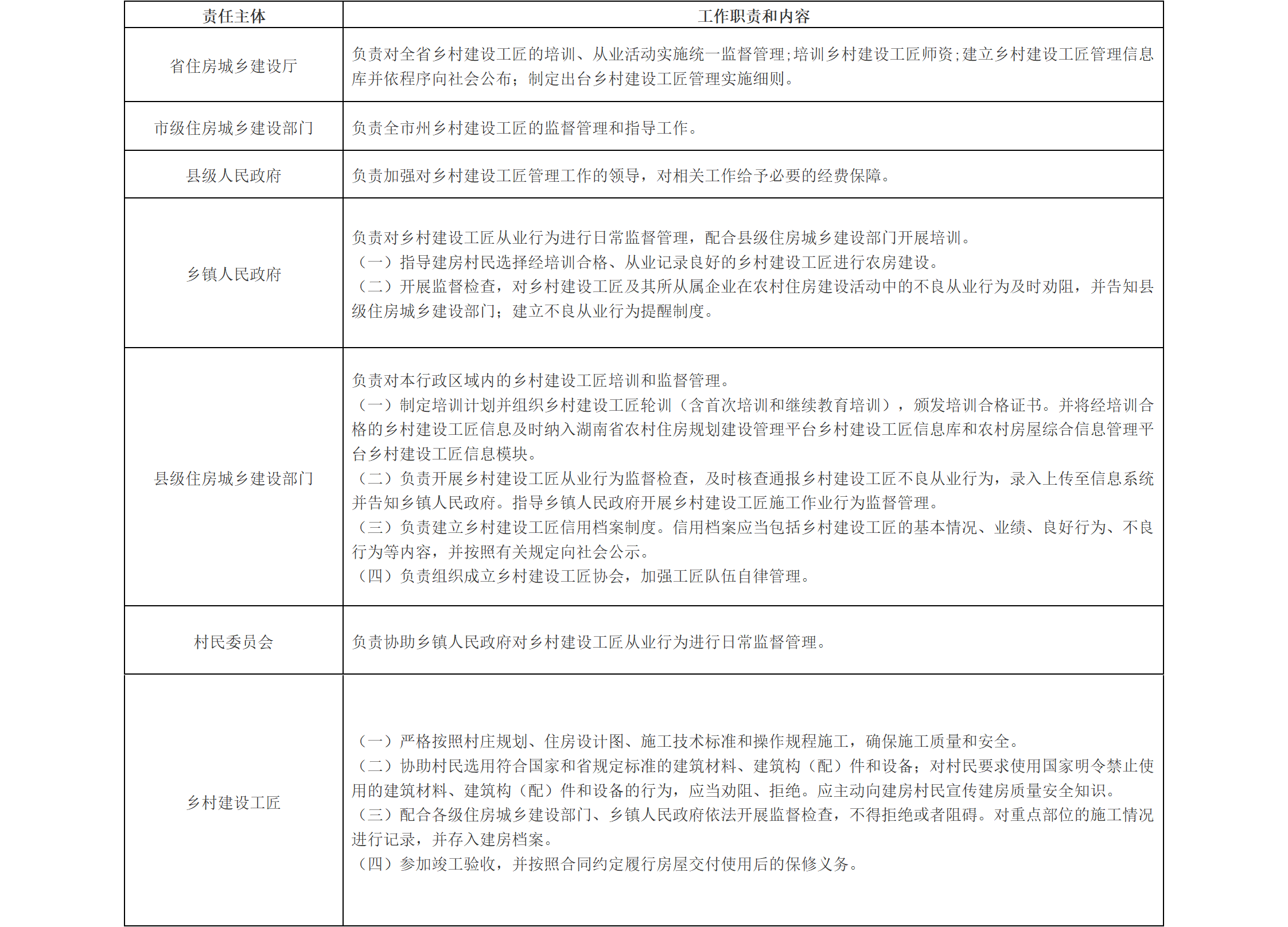 附件2: 村民建房质量安全责任承诺书 (参考文本) 本人 ,身份证号: ,因需拟在 县(市、区) 镇(乡、街道) 村(社区)新建(改建、扩建)一栋层数为 ,总建筑高度为 m,总建筑面积为 m2 ,结构类型为(□砖混结构 □木结构 □框架结构 □其他)的住房。为确保自身及他人生命和财产安全,本人就落实住房建设质量安全管理责任郑重承诺: 一、依法依规取得《乡村建设规划许可证》、《农村宅基地批准书》、公示牌,签订施工协议后,再启动建设。 二、建设施工任务委托给取得培训合格证书的乡村建设工匠或有资质的建筑施工单位承担,并及时与其签订施工合同,严格按照合同约定履行好质量和安全生产管理责任。 三、严格按照宅基地审批时所提供的设计图施工,如确因需要作出变更的,及时将变更后的设计图报原设计单位或设计人员审核。 四、使用合格的建筑材料、建筑构配件和设备。 五、监督乡村建设工匠或建筑施工单位建设行为和施工现场作业活动,督促其按设计图纸、合同要求施工,并督促现场作业人员按规章制度落实安全防护措施,对违法违规行为和违背合同约定行为予以制止,并按规定报告村民委员会、当地乡镇人民政府(街道办事处)或有关部门。 六、落实建房信息公示制度,自觉接受周围群众的监督,如房屋建设活动对毗邻住房居住群众生产生活产生影响,提前告知并妥善解决。 七、自觉接受当地乡镇人民政府(街道办事处)或有关部门的质量安全检查和指导,认真整改检查所发现违法违规行为和质量安全问题。 八、自觉做好房屋使用期间的维护和管理,及时整治房屋质量安全隐患;房屋出现重大险情时,及时做好人员转移和安全警示,并向村民委员会报告;不擅自对已建成房屋进行改扩建或改变其用途。 九、落实“一户一宅”要求,新建住房竣工验收之后,及时完成对原危旧房屋的处置,确保“危房不住人”,并就因危旧房管理不当而侵害他人生命财产安全权益的行为承担法律责任。 承诺人: 年 月 日 此承诺书一式三份,建房村民、村民委员会、乡镇人民政府各保留一份。 附件3: 乡村建设工匠管理工作责任清单 ![]() |