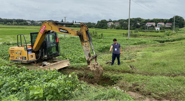 镇防汛指挥所副指挥长、水利管理站站长刘志良对导渗沟开挖现场进行技术指导