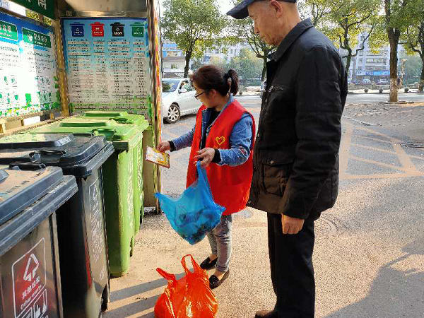 宣传队伍分3组,其中2组采取挨家挨户上门的形式,向居民群众发放《垃圾分类告居民书》、讲解垃圾分类知识,并了解居民家中垃圾的分类情况;另1组蹲守在垃圾分类点,为前来丢弃垃圾的居民进行知识讲解和对要丢弃的垃圾进行分类。活动中,支部宣传队志愿者发现大多数家庭已经开始自觉地分开厨房垃圾和其他垃圾,但分类还不够细致,志愿者将情况一一记录,并亲自指导居民如何正确进行垃圾分类和投放。为提高居民的积极性,红色旗帜联合党支部还采取了垃圾分类打卡积分制,只要居民将垃圾正确分类投放就可以参与指纹打卡累积积分,积分达到一定数量就可兑换生活用品,如垃圾袋、纸巾、洗洁精等。经过志愿者的详细讲解,积极支持垃圾分类的居民章奶奶感慨说:“他们上门了我才知道原来厨房里的垃圾也不全是厨余垃圾,今后我还要再细心一点分类。”