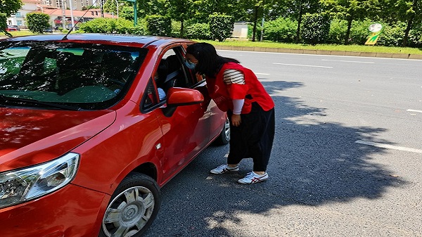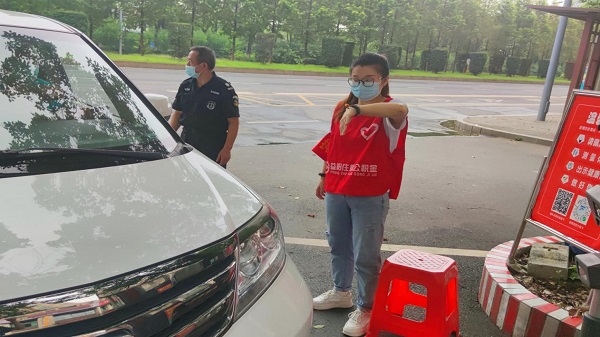 志愿者在锦绣欣城小区卡点值守引导车辆等候检查