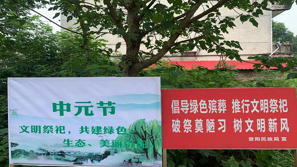 从8月16日起,资阳区民政局每天出动2台流动宣传车,在全区主要街道、公共场所、小区进行全天候巡逻,通过张贴标语横幅、发放巡查手册等方式,向群众宣传倡导不点蜡烛、不放鞭炮、不烧纸钱,采用敬献鲜花、隔空祭祀、家庭追思等低碳环保方式祭祀亲人,寄托思念。