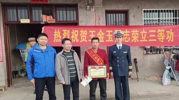 1月13日,区人武部政委金华滚、区退役军人事务局负责人一行,来到长春镇南门桥村,为荣立三等功的现役女军人王金玉家属送去三等功喜报及慰问金。