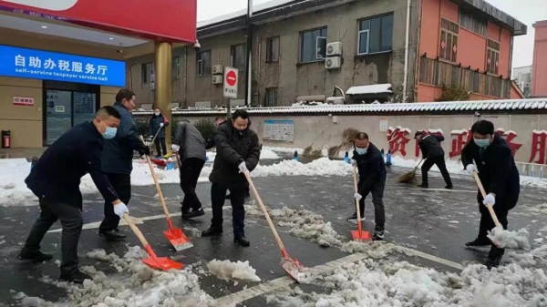区政务服务中心党员干部齐上阵,合力铲雪保畅通,为办事群众提供便利
