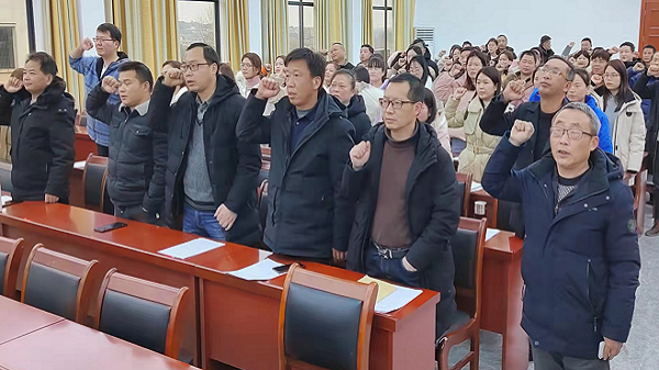 春寒挡不住大家的激情。大会首先由曹建才主任做中考备考方案解读,他建议班主任在第三节晚自习让学生自主学习,精讲精练,顺应“双减”的要求构建高效学习模式。然后,校长汤光华、教导副校长卢胜军、九年级组组长王德华、教师代表陈涛、吴港、莫迎岁等先后发言。最后由王德华组长率全体与会教师宣读誓词。