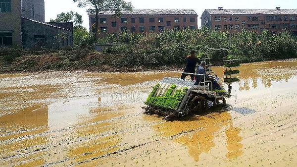 在长春镇打伞树村的田地里,农户熟练地操作着插秧机来回穿梭,吐绿插秧,很快就出现了一排排整齐而又分布均匀的水稻秧苗。“脸朝黄土背朝天,弯腰弓背手种田”正逐步被机械化插秧所取代。