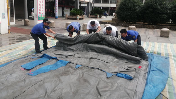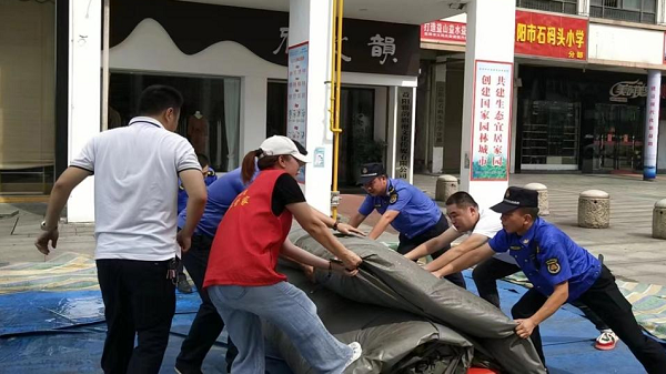 在清除现场,10余名执法人员顶着烈日徒手合力对场内3处乱堆乱放儿童游乐设施进行全面彻底的清理,并进行有效装车处理。
