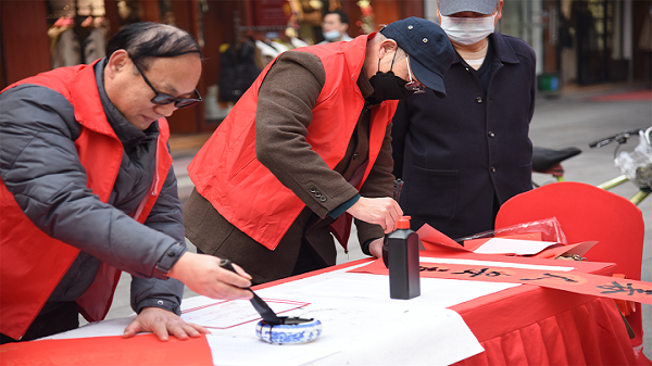 书千联,送万福,让春联艺术“飞入寻常百姓家”,把吉祥祝福送到群众中间。多年来,我区长期开展免费送春联活动,通过每副春联,进一步增强了群众的文化自信,强化了家国情怀,凝聚了中华民族伟大复兴的精神力量,深受群众欢迎。