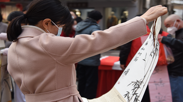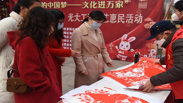 与此同时,伴随着微凉的清风和阵阵墨香,红彤彤的剪纸也闪亮登场,卯兔迎春、纳福葫芦、百花齐放…每张都惟妙惟肖。一幅幅散发着墨香四溢的春联、一张张龙飞凤舞的福字、一个个栩栩如生的剪纸,浓浓的年味儿扑面而来,吸引不少群众驻足。群众在现场收到书法家亲手书写的春联和福字后,无不仔细端详、喜上眉梢。全场活动共送出春联6000余副、“福”字1500余张、挂轴500余副。