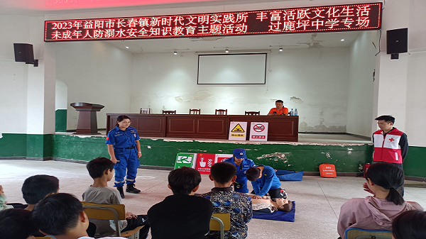 在过鹿坪中学防溺水知识宣讲活动现场,新华救援队教官首先为师生讲解防溺水自救自护相关知识,师生齐读“七不两会”。随后,教官通过模型向师生演示如何对已经救上岸的溺水者进行心肺复苏施救,演示完毕后,在场的师生纷纷动手实操体验人工呼吸及胸外心脏按压模拟救护。