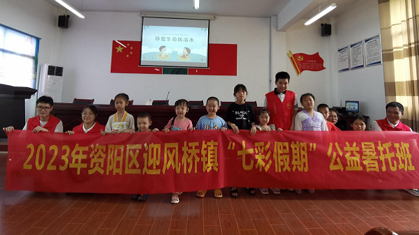 8月9日,资阳区迎风桥镇团委组织5名返乡大学生,在迎风桥镇左家仑村村部开展“七彩假期”公益暑托班志愿服务活动。返乡大学生们为10余名儿童讲解防溺水、保护水资源等知识,进一步筑牢暑期安全防线。