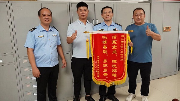 “感谢区市场监管局的不懈努力和倾力相助,终于让我们办好了相关手续,也避免了企业受到处罚。”近日,湖南瑞赛材料科技有限公司相关负责人将一面印有“情系企业,排忧解难 ,热情高效,尽职尽责”的锦旗送到区市场监管局,瑞赛公司两名工作人员高兴地竖起大拇指,对该局倾心为企业排忧解难之举连声表示称赞与感谢。